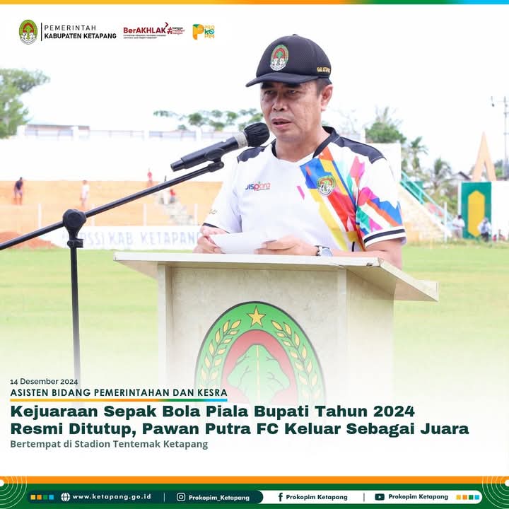 Atas nama Pemerintah Kabupaten Ketapang, Plh. Sekda menyampaikan penghargaan dan ucapan terima kasih kepada seluruh lapisan masyarakat, Dinas Pemuda dan Olahraga Kab. Ketapang, serta segenap panitia dan seluruh perangkat pertandingan Asosiasi PSSI Kab. Ketapang yang telah berperan dalam mensukseskan Kejuaraan Sepak Bola Piala Bupati Ketapang tahun 2024 ini. Tentunya dengan kesuksesan penyelenggaraan Kejuaraan ini akan menjadi modal penting bagi Pemerintah Kabupaten Ketapang melalui Dinas Pemuda dan Olahraga Kab. Ketapang untuk mengadakan event serupa di tahun-tahun mendatang.