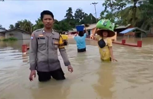 Dalam kesempatan itu, Bhabinkamtibmas bersama aparat desa meninjau langsung kondisi pemukiman warga, memastikan keselamatan penduduk, serta mendata warga yang terdampak banjir.