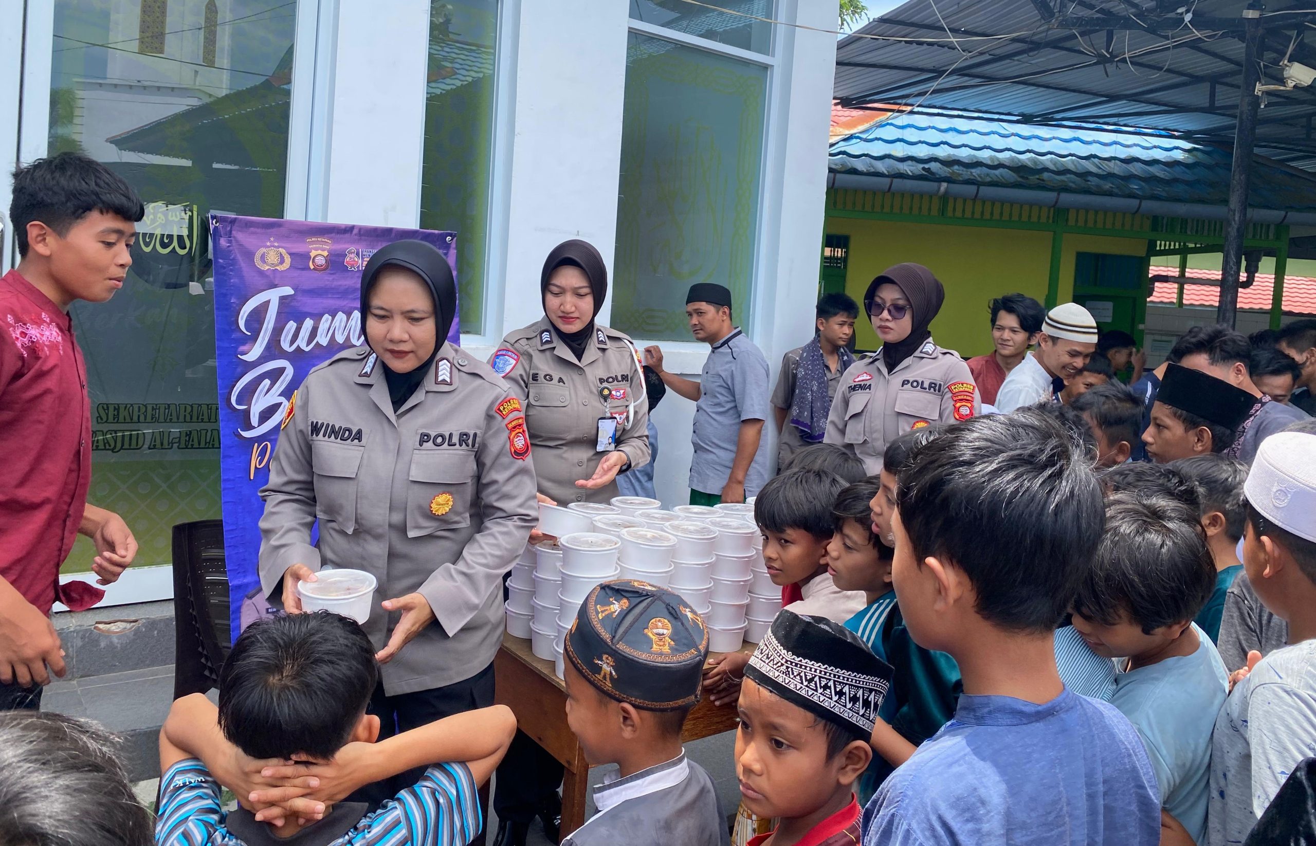 Dalam kegiatan tersebut, Polwan Polres Ketapang menyalurkan bantuan berupa 100 paket nasi lengkap beserta minuman yang diperuntukkan bagi anak-anak santri Masjid Al-Falah.